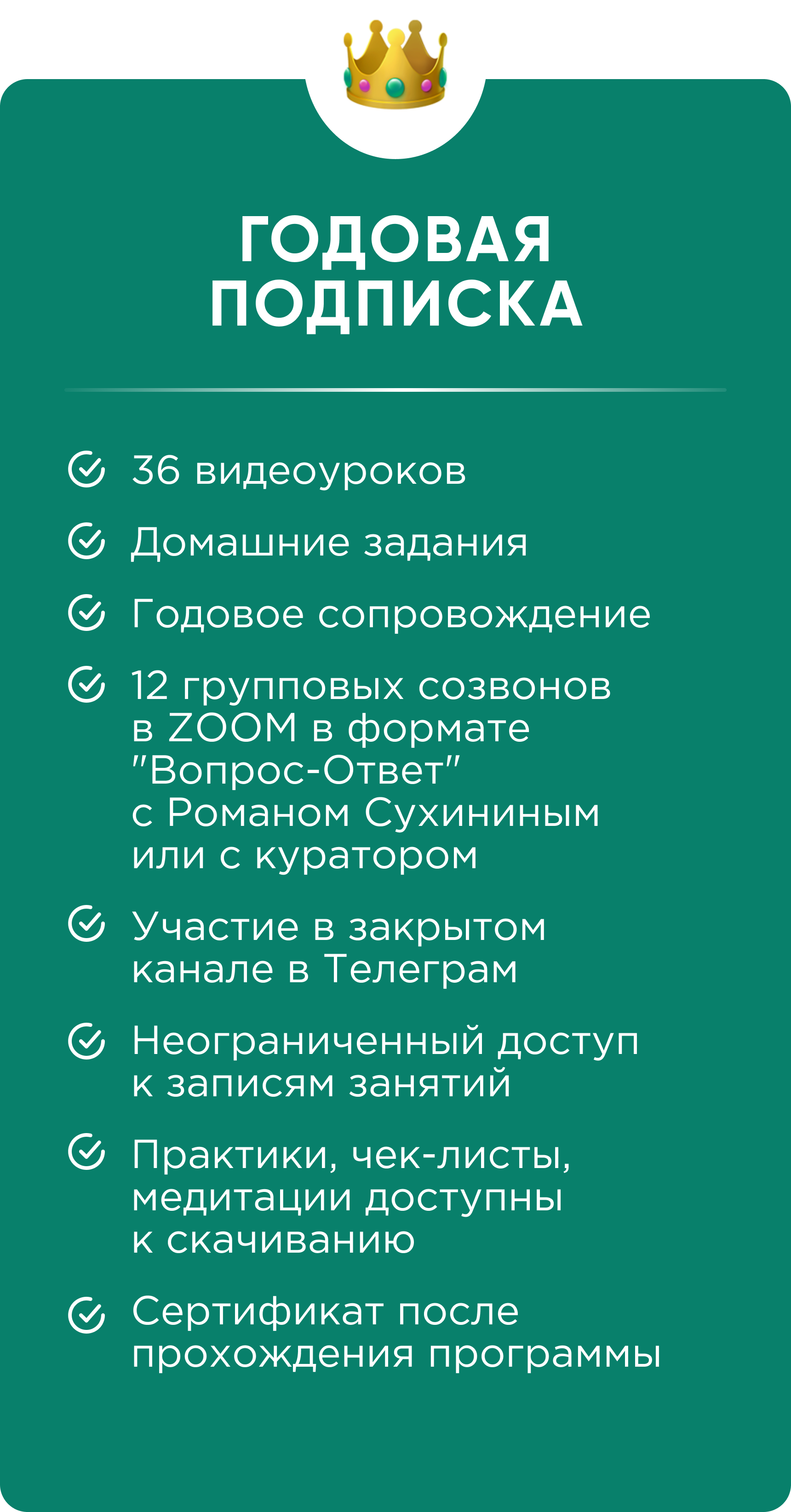При желании, вы всегда сможете пообщаться с людьми, ищущими Путь к Себе рядом с вами. Поделиться с ними, обсудить свои идеи и инсайты, получить обратную связь. За 12 месяцев вы не только осознаете, что для вас важно в жизни на самом деле. Вы узнаете, какие моменты тормозят вас, и научитесь эффективно с ними справляться. Вы поверите в себя. И уже никто и ничто не остановят вас на пути к красивой жизни!
